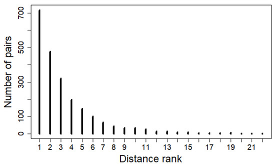 Histogram of the distance rank of the associated tree for each crown of the reference data.