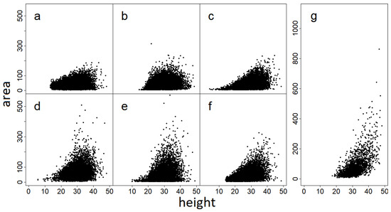 Crowns area (m2) and crowns height (m) for the crowns segmented with the six different methods, and for the manually segmented crowns from the reference dataset. (a) Graph-Cut, (b) E-cognition, (c) ITCSegment, (d) Profiler, (e) SEGMA, (f) AMS3D, (g) Reference dataset.