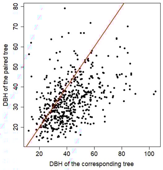 This is also why most methods appear to over-segment crowns. Reference crowns tend to be spaced out while the automatic crowns are often adjacent. Therefore, it is more likely to have several automatic crowns in a manual one than the opposite. This limitation also prevents a complete omission and commission study, often conducted in this kind of benchmark [22,23,47]. Instead of a study of commission and omission rates on all the segmented crowns, we proposed an estimation of the fit of the DBH predicted by the segmented crowns area to the DBH measured during the inventories [2]. This estimation relies on the pairing method, which is slightly biased toward small trees (Figure 6). Indeed, crowns are often paired with trees of smaller DBH than the reference tree validated in the field, but reference trees are tall and large, which may explain this bias (Figure 8). Moreover, we made the assumption of independence between the trunk-crown distance and the tree DBH, but large trunks are potentially further from their crown centroid than small trees. Again, our reference dataset does not allow a complete study of this relation because it predominantly includes fairly large dominant trees.