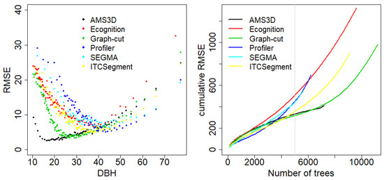 The RMSE was overall larger for small DBH, but also for very large DBH. The AMS3D and Graph-Cut methods clearly outperformed other methods from stems below 40 cm DBH, and AMS3D outperformed all other methods from stems below 30 cm DBH, confirming that 3D methods take advantage of the 3D structure of the lidar point cloud to segment crowns that are only partly visible from above (Figure 7). On the other hand, the SEGMA and Profiler methods had the lowest RMSE for the largest trees (DBH > 60 cm). Overall, the methods that are good at segmenting crowns paired with big trees tend to have reduced accuracy when segmenting crowns paired with small trees, and vice versa. The methods having the most crowns paired with trees also tend to have high RMSE for the smaller crowns (number of trees > 7000 for E-cognition, itcSegment and Graph-Cut on the right in Figure 7). There is indeed a trade-off between the number of crowns actually paired with stems from the inventories and the quality of the pairing evaluated with the RMSE (see Table 4).