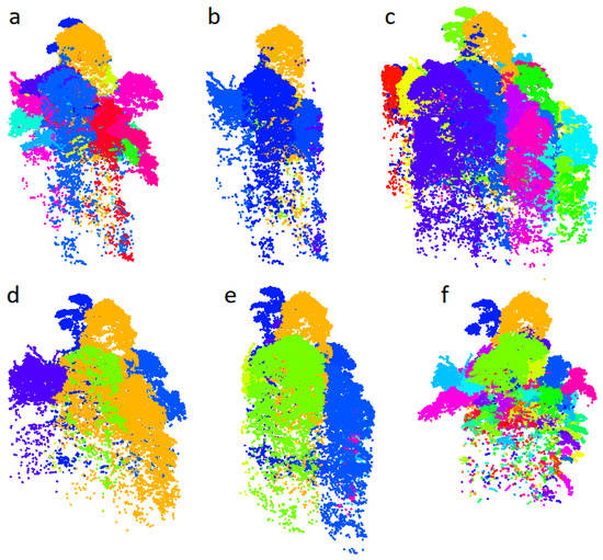 Segmentation of one crown and the neighboring crowns with the six different methods investigated in this benchmark. (a) Graph-Cut, (b) E-cognition, (c) ITCSegment, (d) Profiler, (e) SEGMA, (f) AMS3D. The neighboring crowns are chosen if a least one point of the crown is less than 10 m far from the central crown mean position on the XY plan. Figure realized with the package lidR [40,46].