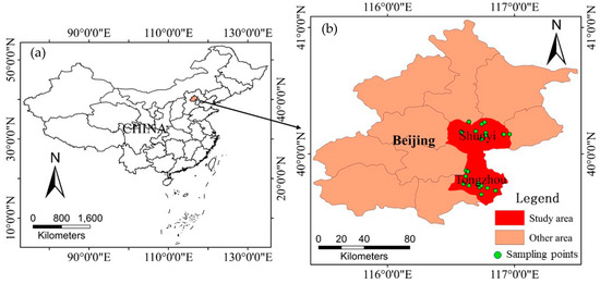 Study area: (a) Beijing in China; (b) Tongzhou and Shunyi districts in Beijing. Green dots are sampling points.