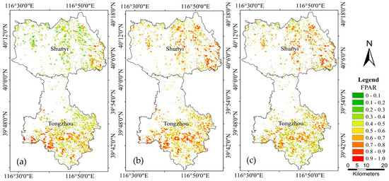 Figure 3 shows the results for fPAR from March to May 2009. The fPAR results for March, which average 0.47, were less than those for April and May, which fell mostly between 0.32 and 0.57. The fPAR for winter wheat in April continued to increase due to the work of photosynthesis and generally exceeds 0.40. The process of photosynthesis of winter wheat gradually weakened as May approaches, so the fPAR values concentrated in the range 0.40–0.60. The greatest average fPAR of 0.59 occurred in April 2009, whereas the average fPAR was 0.53 in May of the same year. These results reflected the mild weather during April, in which hydrothermal and sunlight conditions were suitable for winter wheat growth, resulting in increased photosynthesis of winter wheat and the subsequent increase in growth. In addition, the April and May fPAR results for Tongzhou and Shunyi districts did not differ significantly, which meant that the geographical environment of these two districts was suitable for winter wheat growth.