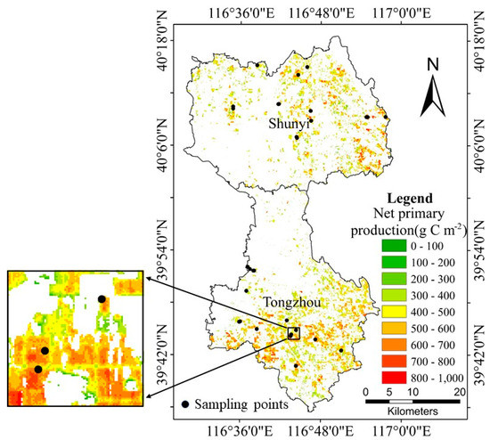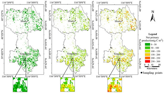 Figure 7 shows the spatial distribution of the total winter wheat NPP for the entire growing season, which was obtained by summing the NPP of each month. The overall distribution of winter wheat NPP in Tongzhou District was similar to that in Shunyi District and was concentrated in the range 300–700 g C m−2, with an average NPP of 464 g C m−2.