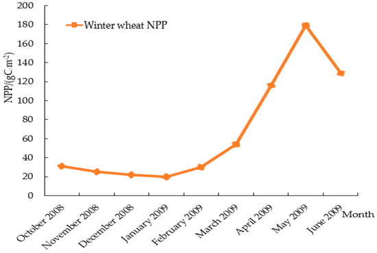 The Tongzhou and Shunyi districts in Beijing have typical continental monsoon climates. The seasonal climate directly affects the formation of winter wheat NPP. Figure 6 shows the mean monthly NPP of winter wheat in the study area as a function of time over the entire growing season. From October to December 2008, the winter wheat NPP in the seedling stage decreased monotonically, primarily because, as the study area gradually entered the winter season, climatic factors such as solar radiation, temperature, and precipitation reached their low point. Thus, winter wheat growth was limited; the growth rate was slow, and the rate of NPP formation was relatively low. From January to March 2009, with the improvement of climatic conditions, the winter wheat gradually passed through the over-wintering stage and entered the stage of rapid growth and development, so the NPP began to increase. From April to June 2009, the winter wheat leaf area continued to increase, photosynthesis, respiration, and other growth activities continued to increase, and dry matter quality accumulated rapidly. Finally, in May, the winter wheat growth and NPP peaked.