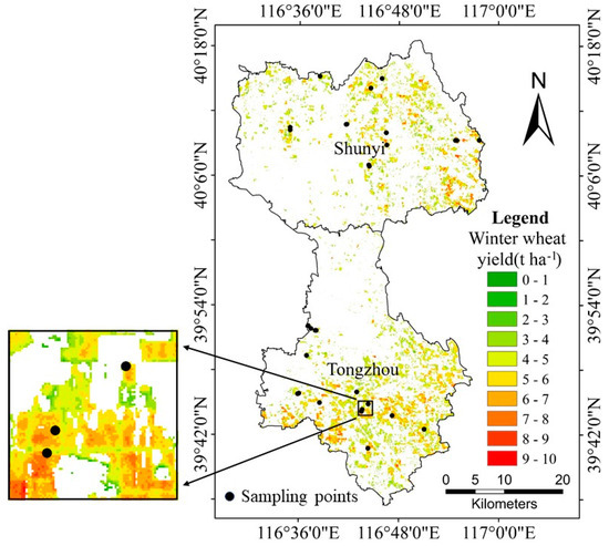 A total of 29 ground-measured winter wheat yield data were used in this study and winter wheat yield were concentrated in the relatively small range of 3–8 t ha−1. An ideal result was obtained by using 29 sampling points in this study area, but if the study area scale is continuously expanded, further research is required to verify the accuracy and applicability of the proposed model.