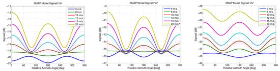 (left) Geophysical Model Function in dB for HH polarization, as a function of relative azimuth angle with different wind speeds as different lines, (middle) same for VV polarization, (right) same for HV polarization. Note the large wind direction modulation for co-polarizations, while the cross-polarization has much less dependance on wind direction. Also note the change in sign of directional modulation and non-monotonicity of the GMF in wind speed as cross-wind.