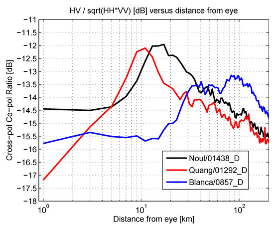 The images of the various storms in Figure 2 would seem to indicate that the HV polarization is essential to retrieval of wind speed for these extreme wind events. In Figure 3 we plot the ratio of the HV to the geometric average of the HH and VV . Noul had category 5 winds and Quang was nearly as strong as Noul when observed by the SMAP SAR, however it was classified as a category 4. In comparison Blanca was a category 2 storm with a much larger eye and covered a much larger area. We cannot know the exact structure of the true winds as a function of distance from the eye, however, we can assert some basic assumptions and see what conclusions may be drawn. Firstly, the maximum speed of the cyclones will typically be in the eye wall, where we observe the maximum HV backscatter in Figure 2a,b in the middle plot of each. Secondly, we can assume that for at least a small distance from the eye that the azimuthally-averaged wind speed is monotonically decreasing as a function of distance from eye, for distances larger than the eye radius. From these two assumptions and the data shown in Figure 3 we can conclude that the HV has an increasing sensitivity as compared to the HH or VV as wind speeds approach and exceed the category 4 and 5 wind speed regimes. For normal wind speeds, the Aquarius GMF derived in [3] gives a cross-pol to co-pol ratio of −16.6 dB at m/s wind speeds (see green curves in Figure 1). We conclude that this increase in sensitivity of the cross-pol channel as compared to the co-pol channels is about 4–5 dB in magnitude from the normal wind speed to category 5 wind speed regimes. This effect is consistent in both of the SMAP SAR observations of category 4 and 5 wind speeds in Noul and Quang.