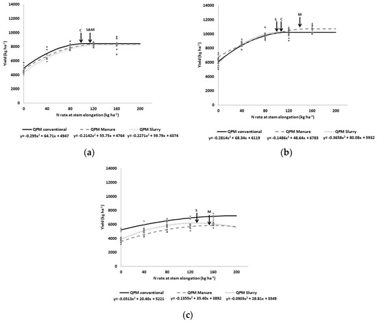 Effect of the N fertilization rate at stem elongation (GS30) on yield (kg ha−1) in 2015 (a), 2016 (b) and 2017 (c); wheat-growing seasons with respect to initial fertilization: conventional treatment, dairy slurry, sheep manure. A quadratic plateau model was used to study the yield response. The arrow marked with C represents the N fertilization rate when the maximum yield was achieved by conventional treatment. S represents the N fertilization rate when the maximum yield was achieved by dairy slurry treatment, and M represents the N fertilization rate when the maximum yield was achieved by sheep manure treatment.