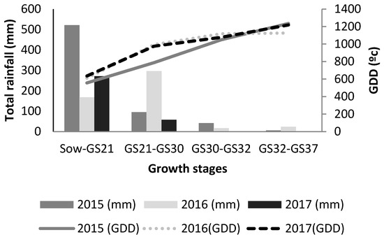 Total rainfall (mm) and growing degree days (GDD, °C) between wheat growth stages [2] in three wheat-growing seasons (2015, 2016 and 2017) in Arkaute. Sow, sowing.