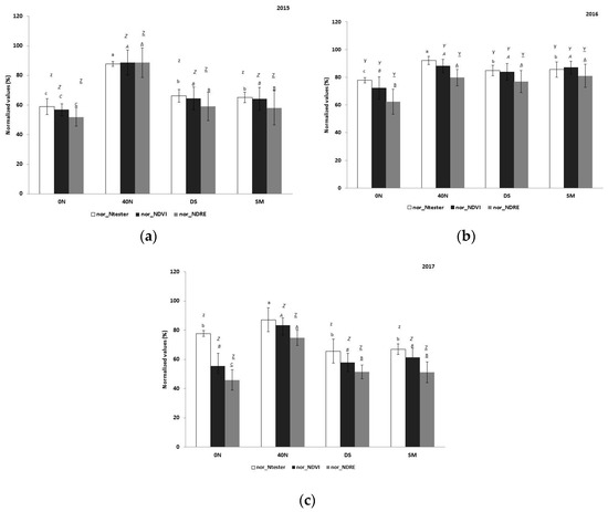 The normalized values of RapidScan CS-45 and Yara N-TesterTM (as a percentage compared to the overfertilized (280 N) treatment) were significantly higher in 2016 (Figure 4b) than in 2015 and 2017 (Figure 4a,c) in all treatments with the exception of nor_NTester values in the conventional treatment. In 2015 (Figure 4a), the normalized measurements of both tools agreed with each other for all treatments, showing differences between the conventional treatment (88%), initial organic fertilization treatments (65%) and 0N (57%). In 2016 (Figure 4b), Yara N-TesterTM showed differences between the conventional treatment (92%), control (78%) and both organic treatments (85%). RapidScan CS-45 showed differences between the conventional treatment (88%) and 0N (72%), but the tool did not detect differences between the conventional treatment and organic treatment (84–87%). In 2017 (Figure 4c), the measurements of both proximal tools detected differences between the conventional treatment (83–87%) and the remaining treatments (control and organics). In 2017, only nor_NDRE detected differences between control and organic treatments.