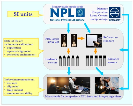 An intercomparison of radiance and irradiance ocean color radiometers (The Second Laboratory Comparison Exercise—LCE-2) using stable incandescent lamp sources under controlled indoor conditions was conducted with the aim to provide one link in the chain of traceability from field measurements of water reflectance to the uniform SI-traceable calibration (Figure 1). Intercomparison of data produced by a number of independent radiometric sensors measuring the same object can assess the consistency of different results and their estimated uncertainties depending on the type of the sensor, the spectrum of measured radiation, the environmental conditions, and the particular method used for collecting and handling the measurement data [1,2]. This information can also serve for further elaboration of uncertainty estimation. Additionally, methodologies used by participants for the measurements and data handling can also be critically reviewed. For the LCE-2, a stepwise approach was chosen: first, the radiometric calibration of the sensors was conducted by the same calibration laboratory; second, indoor comparisons using various levels of radiance or irradiance measurements were performed in stable conditions similar to those during radiometric calibration; third, field measurements as described further in [3]. Traceability of the in-situ measurements to SI units is established by regular calibration of field radiometers. Thus, immediately before the comparison, Tartu Observatory (TO) performed consistent calibration of all participating radiometers in order to guarantee that differences in comparison results will not be primarily due to various calibration sources and/or calibration times. Radiometric calibration procedures including respective uncertainties have been, in general, well established over the last decades, tested by several intercomparisons [2,4], and also confirmed by the current experiment. Although during the measurement of stable radiation sources the observations in recorded time series are not always completely independent, their autocorrelation can be accounted for and analysis results (including determination of reference or consensus values) is rather straightforward. Small variability between individual sensors found during the current experiment confirms usefulness of the radiometric calibration performed at the same laboratory just before the comparisons.