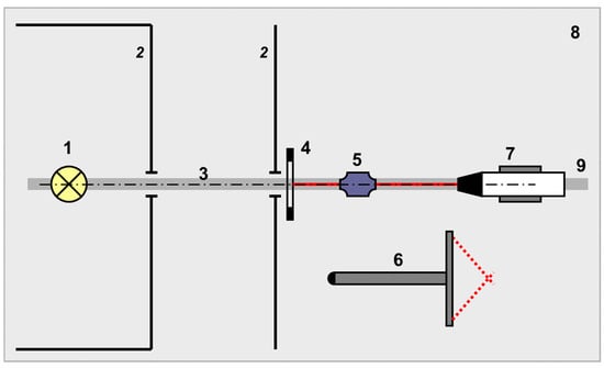 Indoor irradiance comparison. 1—FEL lamp; 2—baffles; 3—main optical axis; 4—alignment jig; 5—alignment laser; 6—distance probe; 7—radiometer on the support; 8—optical table; 9—optical rail.