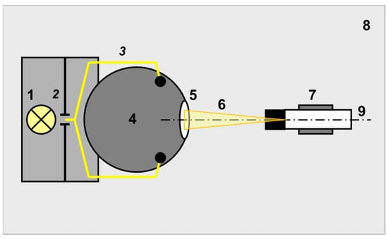 Indoor radiance comparison. 1—quartz tungsten halogen lamp; 2—variable slit; 3—optical fiber; 4—integrating sphere; 5—output port; 6—FOV of the radiometer; 7—radiometer on the support; 8—optical table; 9—main optical axis.