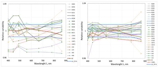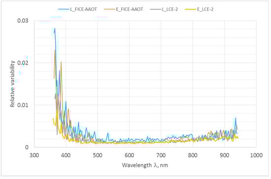 The variability of calibration coefficients of radiance and irradiance sensors due to adjustment of the lamps, plaques, and sensors, and due to short-term instability of the lamps and sensors is depicted in Figure 9. All the radiometers were calibrated before LCE-2 using the same pair of lamps (Section 2.2 and Section 2.3). Two sets of calibration coefficients were obtained for each sensor and the difference between the lamps was presented as the ratio of these coefficients. The curves in Figure 9 are calculated as standard deviations from the ratios of a whole set of calibration coefficients determined by using the two standard lamps. The systematic difference between lamps (due to small difference in traceability to SI) is neglected and only the other uncertainty components related to individual setting up and measurement of radiometers are accounted for by using standard deviation. Data in Figure 9 include calibration of more than 25 sensors for LCE-2 intercomparison and also for FICE-AAOT intercomparison one year later when a different pair of lamps was used. Remarkable in Figure 9 is the rapid increase of variability between sensors in the UV region.