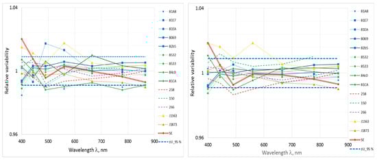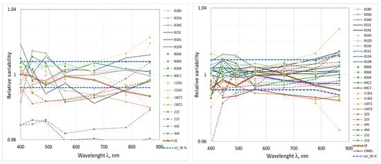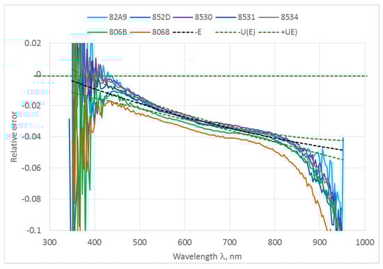 The comparison results are presented as deviation from the consensus value. Despite the different sensor types, as the radiation sources used for indoor comparison were spectrally very similar to calibration sources, agreement between sensors was satisfactory for radiance and for irradiance sensors (Figure 5, Figure 6, Figure 7 and Figure 8) with no outliers present. In these figures, blue dashed lines show the expanded uncertainty covering 95% of all data points on the right graphs. Solid lines represent RAMSES sensors, dashed lines—HyperOCR sensors, double line—SR-3500, and dotted lines—WISP-3 sensors.