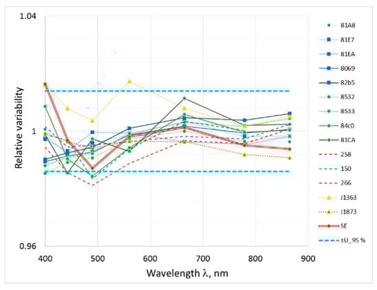 The uncertainty analysis has been carried out according to the ISO Guide to the Expression of Uncertainty in Measurement [31]. The evaluation is based on the measurement model, which describes the output quantity y as a function f of input quantities xi: y = f(x1, x2, x3 …). Standard uncertainty is evaluated separately for each input quantity. There are two types of standard uncertainties: Type A is of statistical origin; Type B is determined by any other means. Both types of uncertainties are indicated as standard deviation and denoted by s and u respectively. The uncertainty component arising from averaging a large number of repeatedly measured spectra of radiation sources by array spectrometers is considered as Type A. Contributions from calibration certificates (lamp, current shunt, multimeter, diffuse reflectance panel, etc.), but also from instability and spatial non-uniformity of the radiation sources are considered of Type B. For all input quantities relative standard uncertainties are estimated. The relative combined standard uncertainty of output quantity is calculated by combining relative standard uncertainty of each input estimate by using Equation (12) in [31]. Uncertainty of the final result is given as relative expanded uncertainty with a coverage factor k = 2.