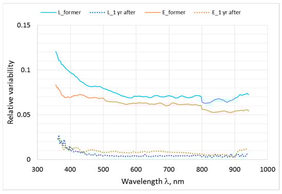 Relative variability of calibration coefficients of radiance (L) and irradiance (E) sensors: former—difference of previous known calibrations and results of LCE-2 calibration; 1 yr after— changes during one year after LCE-2 calibrations, some extra-large changes excluded.