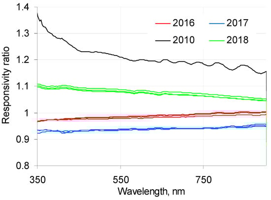 Relative change of responsivity of the SAM 8329. Year of the radiometric calibration is shown with color: 2010 black, 2016 red, 2017, blue, 2018 green.