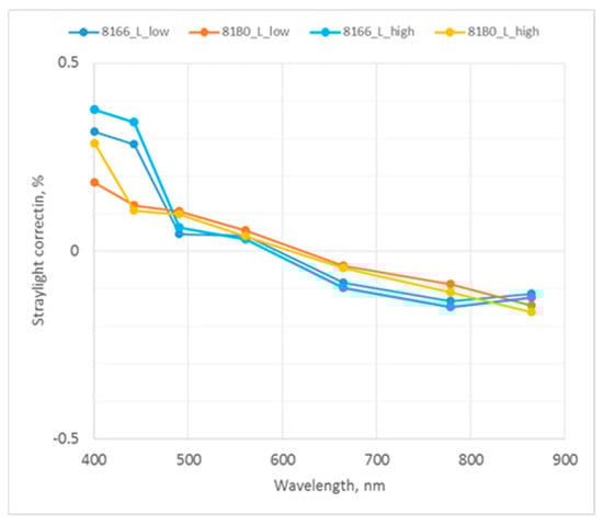 Spectral stray light of sensors is commonly not very relevant for measurements when the calibration and target source emissions have similar spectral composition. Value is estimated from Figure 14 in Section 4.1.5, and from [22,32].