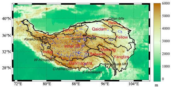 Topography of the Tibetan Plateau (TP) with a distribution of lakes (in blue). The whole region is divided into 10 basins, involving 7 exorheic drainage basins (Indus, Brahmaputra, Mekong, Salween, Yangtze, Yellow, and Hexi) and 3 endorheic drainage basins (Tarim, Inner TP, and Qaidam). Red lines indicate major mountain ranges.