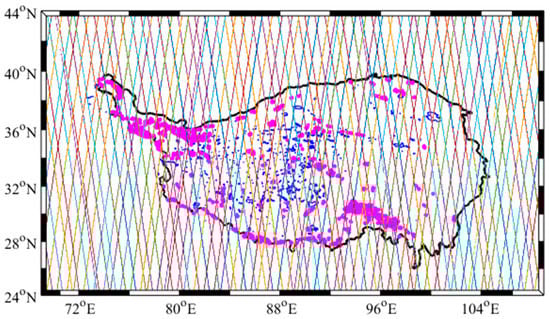 We used the ICESat/GLAS level 2 altimetry product (GLA14) that includes the global land surface elevation data, the footprint centroid geolocation, the laser reflectance, the geoid, the instrument gain, the waveform saturation and many other related parameters []. The ICESat/GLA14 Release-34 elevation data crossing the Tibetan Plateau over the period from March 2003 to October 2009 were obtained through the U.S. National Snow and Ice Data Center (NSIDC). The ICESat ground tracks over this period are illustrated in Figure 2.