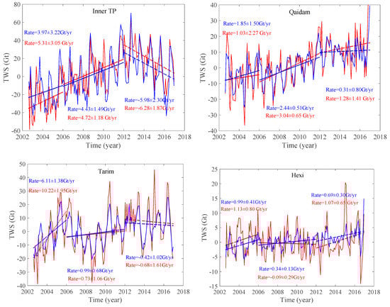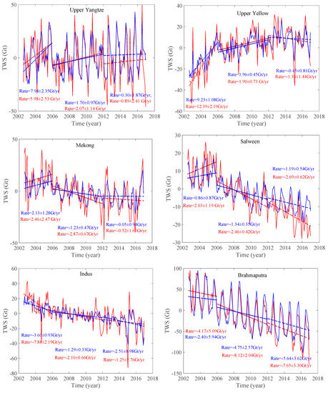 Time series of the water storage variations (TWS) on the Tibetan Plateau between August 2002 and December 2005, between January 2006 and December 2011, and from January 2012 to December 2016. Blue lines represent direct estimates from GRACE monthly solutions. Red lines show reconstructed mass variations by using a forward modeling technique. Blue dotted lines present a linear rate of direct GRACE estimates, and red dotted lines show a linear rate of reconstructed mass variations.
