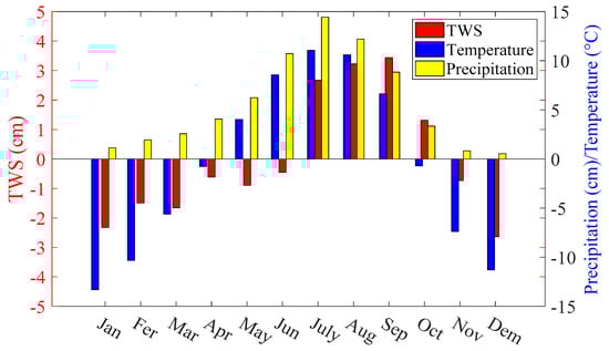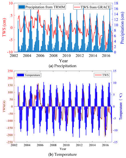 The plateau climate is dominated by a (seasonal) monsoon, which affects precipitation and air temperature in this region. To inspect this factor, we analyzed precipitation extracted from the TRMM-3B43 monthly rainfall data and air temperature from the CNMIC dataset. As seen in Figure 6, the water storage varies with both precipitation and temperature.
