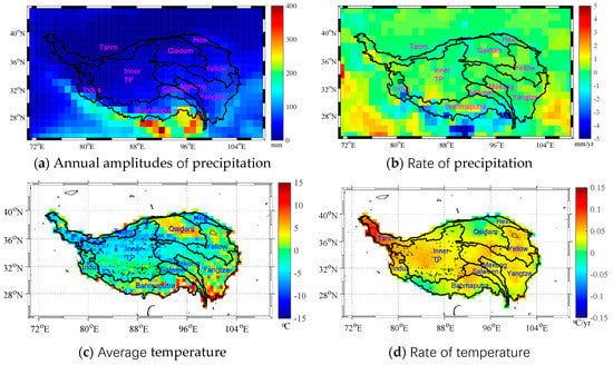 Annual amplitudes (a) and rates (b) of precipitation. Air temperature averaged over 15 years between 2002 and 2016 (c), and its rate of temperature (d).