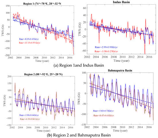 Time series of the water storage variations in (a) Region 1 (28°–32° N, 74°–78° E) (left panel) and the Indus basin (right panel) and (b) Region 2 (88°–92° E, 25°–28° N) (left panel) and the Brahmaputra basin (right panel) from August 2002 to December 2016. For an explanation of rates, see the legend in Figure 4.