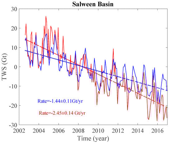 Time series of water storage variations in the Salween basin from August 2002 to December 2016. For an explanation of rates, see the legend in Figure 4.