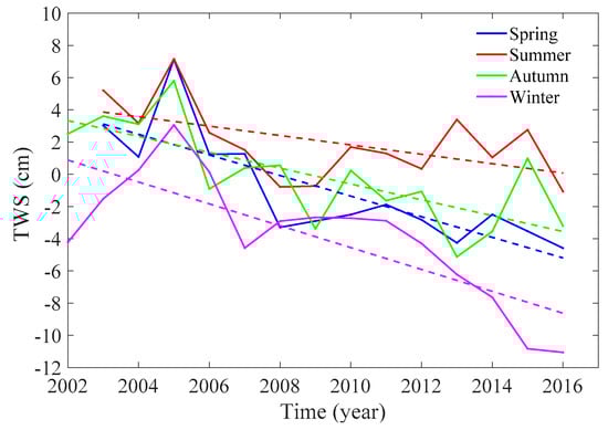 Monthly means of water storage, temperature, and precipitation averaged over the period investigated are shown in Figure 10. In addition, seasonal trends of water storage variations for the same period during spring, summer, autumn, and winter are plotted in Figure 11. The water budget of the Tibetan Plateau exhibits relatively large annual oscillations (Figure 10). In summer, tropospheric tropical easterlies, subtropical westerlies, stratospheric easterlies, and the southwestern monsoon from the Indian Ocean [] bring a significant amount of rain, causing maximum precipitation between June and September []. A large amount of rainwater that accumulates on the Tibetan Plateau during wet summer months causes an overall increase in the total water budget, reaching maxima typically in September. Dry and cold winter periods are characterized by an overall water mass loss mainly due to river water run-off, reflecting very low precipitation. Nonetheless, regardless of season, water storage generally decreased (Figure 11). After reaching maxima in 2005, the fastest decrease in the total water budget of the plateau occurred during each winter, confirming temperature increase as a dominant factor.