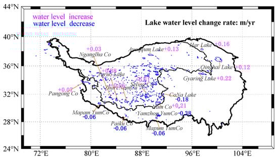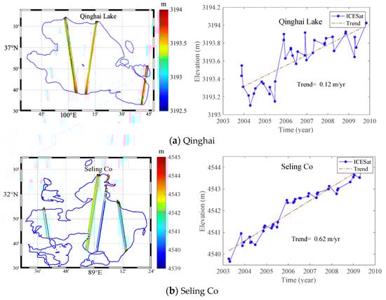 Previous studies have demonstrated that water level changes in lakes determined from ICESat/GLAS altimetry agree relatively closely with those determined from in situ gauge observations [,]. However, some intra-annual fluctuations in water level could not be detected due to limitations of ICESat. Therefore, a bias in water level trends may be inevitable for limited campaigns. The complex terrain geometry also worsens the accuracy. This particularly applies for glaciers situated in the Himalayas and the Western Tibet Plateau, where large elevation gradients significantly affect estimates of glacier elevation changes from relatively sparse tracks of ICESat.