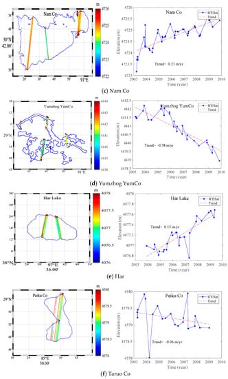 The ICESat tracks through lakes (left panels) and the water level changes (right panels) of (a) Qinghai, (b) Seling Co (also called Selin Co in some studies), (c) Nam Co, (d) Yumzhog YumCo, (e) Har (also called Hala Hu), and (f) Paiku Co over the period from March 2003 to October 2009. We note that “Co” means lake in Tibetan language.