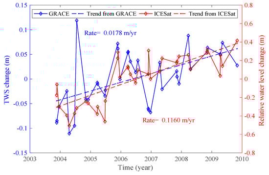 Some studies indicate possibilities of using the GRACE data to monitor water storage variations of relatively small lakes, such as Qinghai [,]. This is possible especially if their hydrological signal is quite isolated from other signals. To illustrate this, we plotted time series of the annual rates of the ICESat water level change and the GRACE water storage change for Qinghai Lake in Figure 14. Though both results exhibit overall similarities in their secular trends, significant annual (as well as inter-annual) inconsistencies are obvious.