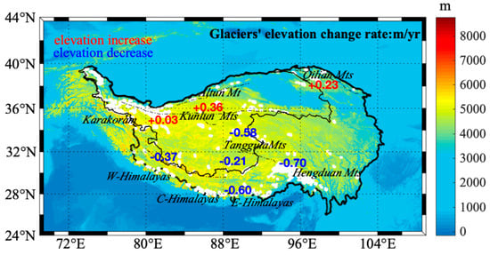 We used ICESat data to investigate elevation changes of large glaciers on the Tibetan Plateau. The results are presented in Figure 15. Glaciers of the Qilian and Altun Mountains (in the northern part of the plateau) and glaciers of the Kunlun Mountains (in the central part) show increasing trends. In the Himalayas and the Hengduan Mountains, the ICESat (as well as GRACE) results indicate a rapid decrease of glacier volumes and elevations. For glaciers located in the Hengduan Mountains, for instance, glacier elevations decreased at a rate of about −0.7 m/yr and the glacier mass loss was at a rate of −0.02 m/yr.