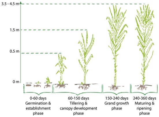 Sugarcane is a semiperennial crop; after each growth cycle, typically lasting for 12 to 18 months for Brazilian plantations [], new ratoons emerge from the same root system. Since the yield decreases over time, the plants and the root system are generally removed after five to seven years, and new shoots are planted. Indicatively, the growth cycle follows phenological phases as depicted in Figure 1. During the last phase, the sucrose content in the stem accumulates and senescence of the leaves occurs [,,].