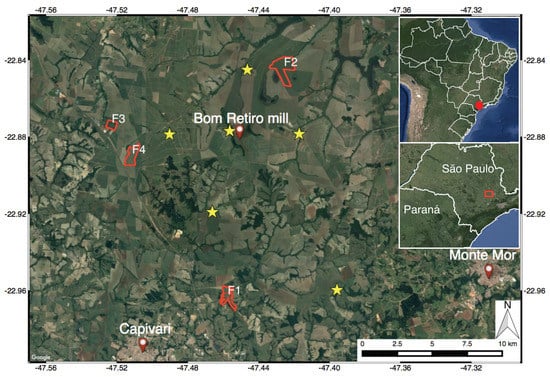 Sugarcane is the number one globally cultivated crop in terms of production quantity, more than the second and third crops, maize and rice, combined. Brazil is the largest sugarcane producer, amounting to almost 40% of total global production [], while São Paulo state hosts more than 60% of Brazil’s sugarcane acreage [,]. Over the last 15 years, this acreage more than doubled []. The main products are sugar and bioethanol; the latter allows Brazil to reduce the national automotive’s gasoline consumption by more than half []. This illustrates the importance of sugarcane production and research in São Paulo, which hosts the area of study.