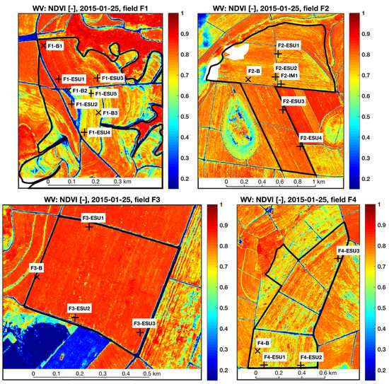 The acquisition schemes of ground-reference and remote sensing data (Figure 6) show that the entire growth cycles are covered by ground and space measurements, except for SAR data during the first three months of Fields F3 and F4. Of the 29 LS8 acquisitions available, 11 had clear-sky observations for all fields. For all sensors, the number of acquisitions were counted between 1 July 2014 and 31 December 2015, i.e., just before the first start of growth and after the last harvest event of the fields. WorldView imagery consists of two WorldView-2 (WV2) images and one WorldView-3 (WV3) image. The WV2 images were acquired on 25 January and 11 August 2015. The WV3 image was acquired after the harvest events on 21 March 2016, and was used for additional visual inspection of the fields.