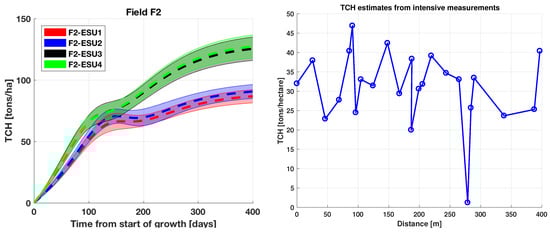 Estimated tons cane per hectare (TCH) over growth time for each elementary sampling unit (ESU) of Field F2, along with the associated uncertainties (left). F2-ESU1 and F2-ESU2 nearly overlap; similarly for F2-ESU3 and F2-ESU4. Profile of biomass estimates 400 m along from the intensive measurement at Field F2 (right).
