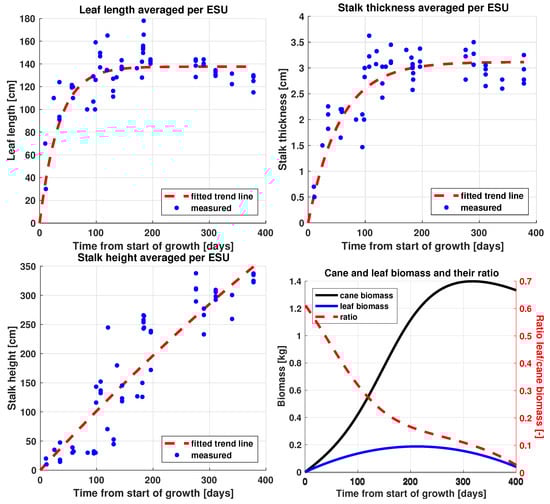 Temporal developments of measured leaf length, stalk thickness, and stalk height, averaged per ESU and accompanied by fitted trend lines. The cane and leaf biomass (in kg) per cane and their ratio over time are based on the trend lines of individual stalk- and leaf-biomass measurements.
