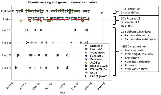 Temporal distribution of remote sensing images and ground-reference measurement dates. (Right box) summary of acquisitions, including number of image acquisitions per sensor, counted over growth duration. Landsat-8* symbols, LS8 acquisitions without cloud obstruction for all fields.