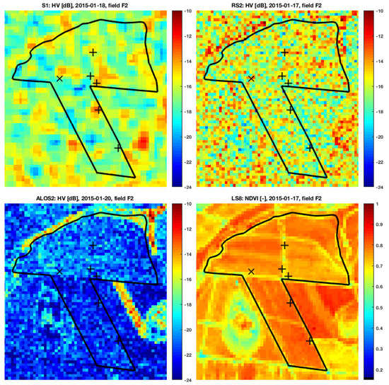 For ALOS-2, the patterns with the highest z-score values occurred in the northeastern part of the field, coinciding with the lowest field elevations. As was described in Section 1, soil backscatter contribution, which is particularly dependent on soil-moisture content, is under standing vegetation conditions higher for L-band SAR than for C-band SAR. Consequently, higher values in the field’s northeastern corner may be associated to high soil and plant moisture. The patterns in the southern part are not evidently consistent with image patterns of other sensors, and ground observations cannot give conclusive explanations for this.