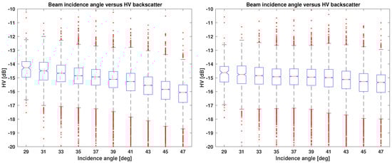 where is the beam-adjusted RS2 backscatter coefficient, is the original RS2 backscatter coefficient, is the RS2 incidence angle over the fields (which differs per mode), and is the S1 incidence angle over the fields (taken as 36.3°). Notice that this angle correction is equivalent to using the Gamma nought ()-normalized backscatter. As an illustrative example of the effects of this equation, we applied the correction on one S1 EW image (swath width 400 km) covering more than 40,000 sugarcane fields that were delineated by the Canasat project [,]. Before correction, the median signal backscatter ranged between −14.3 dB at a 29 and −16.1 dB at 47 incidence angle (see the left part of Figure 8). After correction, the spread of the median signal backscatter ranged from −14.6 dB at a 29 to −15.3 dB at 47 incidence angle; the median at 36.3° before and after correction remained −14.9 dB (see the right part of Figure 8). Since the RS2 signal radiometric stability was smaller than 1 dB [], we accepted this method for reducing the spread.