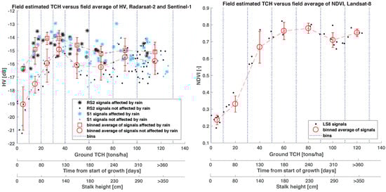 RS2 and S1 combined HV (left) and LS8 NDVI (right) signals versus binned values of estimated TCH, showing the effect of rain events on the signal. RS2 values were corrected for beam angles to the S1 angle. Additionally, the approximate and indicative axes of time from start of growth and stalk height are added. Bars illustrate standard deviations of remote sensing signals within each each TCH bin.