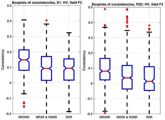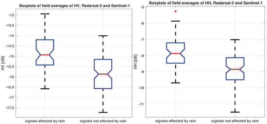 Box plots of RS2 and S1 HV (left) and HH (right) signals combined over sugarcane fields after their saturation points, showing the effect of rain events on the signal. Central (red) line indicates the median, and bottom and top box edges represent the 25th and 75th percentiles, respectively. Whiskers spanning to the most extreme data points were not considered outliers, and cover approximately 99% of the values. Notches represent the 95% confidence intervals of the median.