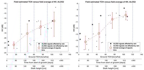 ALOS-2 HV (left) and HH (right) signals versus TCH, with signal averages taken from combined signals affected by rain and not affected by rain. Approximate and indicative axes of time from start of growth and stalk height were added.