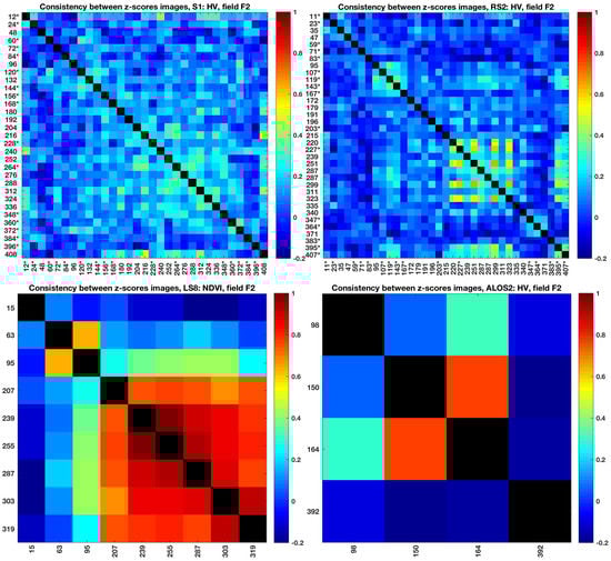 The highest correlations between the averaged z-score images (see the lower right matrix in Figure 17) occurred between the optical sensors, followed by correlations between the C-band sensors. The images of both LS8 and WV2 showed agreement on the intrafield road features (see also the NDVI image of Field F2 in Figure 3 and Figure 7) and regional differences between the northern and southern part of the field. For the C-band SAR sensors, the images showed locally contrary behavior in the northern part of the field, i.e., the eastern part featured high values for S1 and low values for RS2, and conversely for the western part. More corresponding behavior was found in the southern part of the field. On a coarser level, the northern part of the field showed higher values than the southern part for both sensors.