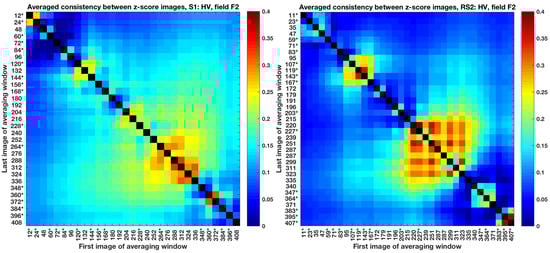 From previously presented consistency matrices per sensor, we computed an average z-score image from the z-score images present in the time windows with highest consistencies. The similarities of these average z-score images between the SAR and optical sensors were measured by the (Pearson) correlation.
