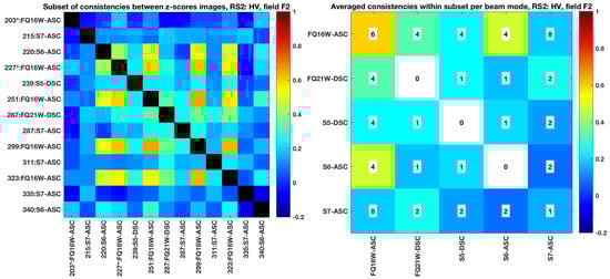 The subset with highest consistencies for RS2 from Figure 13 accompanied by beam-mode information shows that the highest similarities were found between images taken in the FQ16W and S6 modes from ascending passes (see the left matrix of Figure 15). This is confirmed by the averaged consistencies for all beam-mode combinations within the window from 220 to 323 days after start of growth (see the right matrix of Figure 15). Contrary to the relatively high consistencies between these two modes, their consistencies with S7-ascending images are close to zero. This can be explained by the relative high incidence angle for S7, approximately 49, with respect to the angles for FQ16W and S6, approximately 36 and 42. The hour of acquisition for these modes was approximately similar (all around 21:00 UTC). The two images that were taken on the same day (287 days after growth) showed that changing beam modes (FQ21-descending and S7-ascending) results in low image similarity. In addition to their difference in incidence angle and look direction, low consistency may also be caused by the FQ21-ascending mode acquiring in the morning (when potential dew causes more surface wetness) versus the S7-ascending mode acquiring in the late evening (when the heat of the day causes lower moisture content).